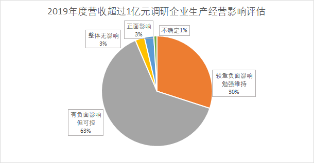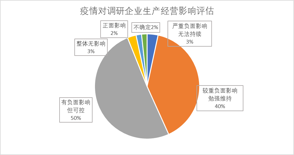 调研表明,本次疫情给90%以上(94%)的企业带来了不同程度的负面影响。其中,3.4%(10家)的企业存在严重负面影响,可能导致无法经营;39.8%(118家)存在较严重负面影响,但可勉强维持;50.7%(150家)存在负面影响但可控。只有6.1%(18家)的企业表示疫情对企业无影响或有正面影响。