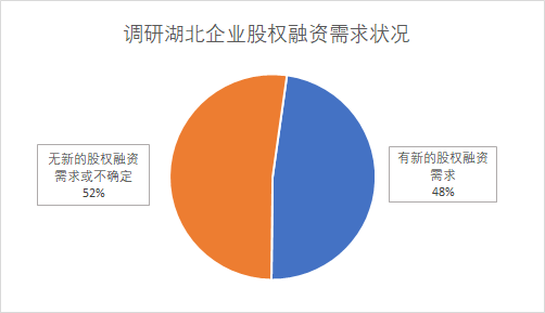 一是近半数省内调研企业有股权融资需求。调研显示,48%的(106家)湖北企业近期有新的股权融资需求,额度从300万元到1亿元不等。其中,新一代信息技术领域的企业意向最为强烈,达到21家。67.9%的(72家)企业期望融资规模在1000-5000万元,其中,期望融资规模5000万的企业达到19家。调研企业中,绝大多数企业希望在今年三季度前完成融资计划,以尽快获得资金支持。