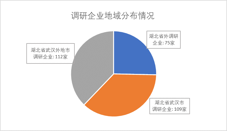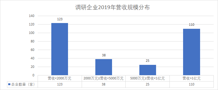 从企业规模结构看,调研企业中,2019年营收1亿元以上企业110家,占比37.1%;营收5000万元-1亿元企业25家,占比8.4%;营收2000万元-5000万元企业38家,占比12.8%;营收2000万元以下企业123家,占比41.6%。其中,湖北省内营收2000万元以上企业136家,占比61.5%;营收2000万元以下企业85家,占比38.4%,表明湖北省内调研企业中规模较大企业相对较多。
