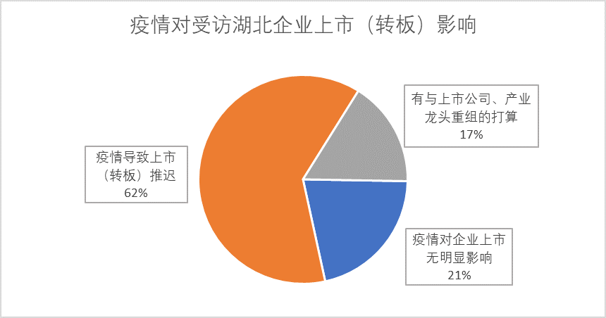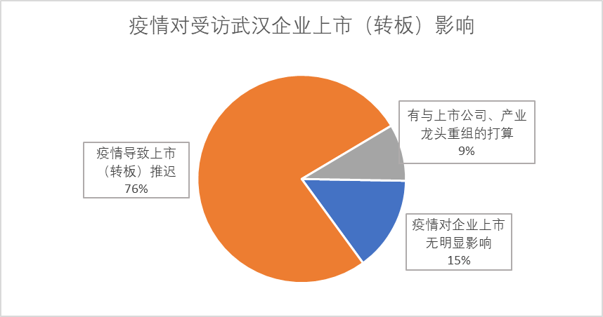 二是部分企业上市、重组意愿明确,但多将因疫情延迟。调研显示,在湖北企业中,有51家近期有上市计划,10家有与上市公司、产业龙头重组的计划。但疫情对湖北企业上市产生明显影响。在近期有推进上市计划的企业中,62%的(39家)企业表示疫情将导致上市计划推迟。武汉市内影响更为明显,近80%的武汉拟上市企业预计推迟上市计划。
