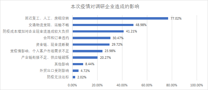 调研表明,疫情防控带来的直接影响是当前企业面临的共性问题。其中,影响最突出的包括:“延迟复工、人工成本、房租水电空转”占77%,“交通物流受阻导致的原材料供应不足、产品供销不畅”占49%,“防疫成本增加对企业现金流造成较大负担”占41.2%。同时,“资金链、现金流断裂”、“合同和订单违约”以及“下游客户的供应商地位可能被取代”等长期性影响也较为普遍。从影响周期看,疫情防控带来的直接影响将会随着防范措施的解除、企业的复工等逐步化解,但企业资金链断裂、出口降低、供应商地位被取代等带来的影响则更长远。