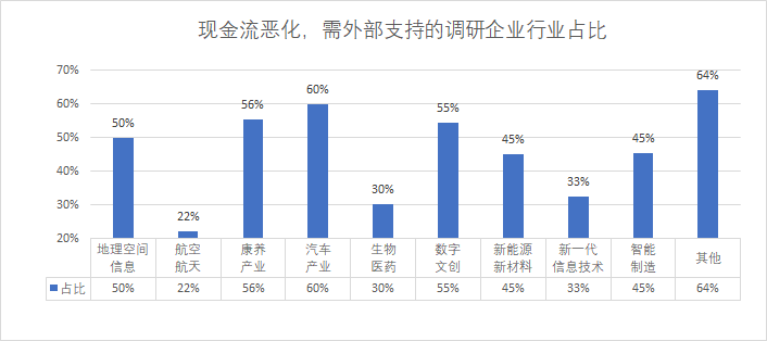 调研表明,除生物医药、航空航天、新一代信息技术等少数领域企业整体相对乐观外,汽车产业、数字文创、康养产业等行业企业在经营现金流方面受到冲击较大,超过一半上述企业都表示需外部资金支持。