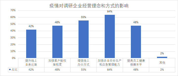 调研企业表示,本次疫情是一次对企业自身反应速度、应变能力、经营模式韧性等抗风险能力的综合考验。疫情过后,企业将更清楚地了解自身在应对外部变化、市场竞争环境下的不足和改进优化的方向。调查中,98%(290家)的企业表示将在经营理念、工作方式上有所改变。包括:60%以上的企业“将加强企业安全和应急管理能力的提升”,48%的企业“将进一步注重提高员工健康保障水平”;55%的企业表示“将增强线上办公方式”,42%的企业“将加大线上业务开发”;48%的企业“将加强客户粘性的重视与培养”等。