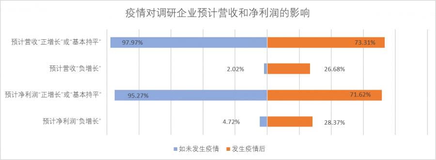 利润方面。如未发生疫情,95.3%的(282家)企业预计2020年净利润较上年将实现增长或基本持平。受疫情影响,仅71.6%的(212家)企业做出同等预测,预期增长的企业数量下降了24个百分点。湖北省内企业中,如无疫情影响,95.9%的(212家)企业预计2020年净利润较上年将实现正增长或持平;疫情发生后,作此预测的企业仅占66.1%(146家),下降了近30个百分点。